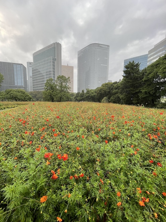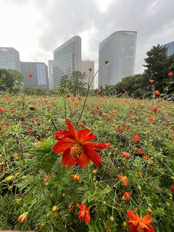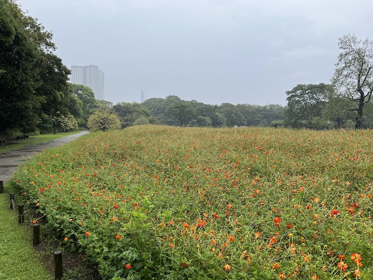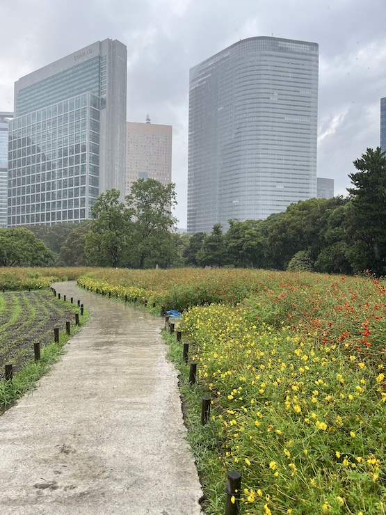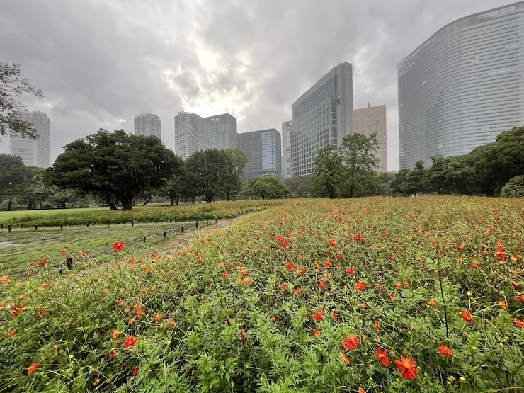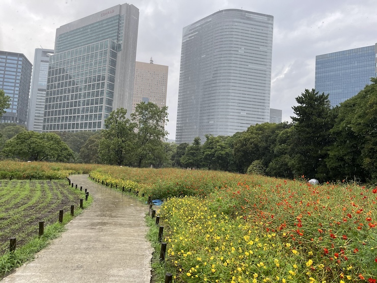 キバナコスモスで有名な浜離宮を訪問。あいにく夕立(雷と豪雨)に見舞われ、1時間以上敷地内の建物内に避難。