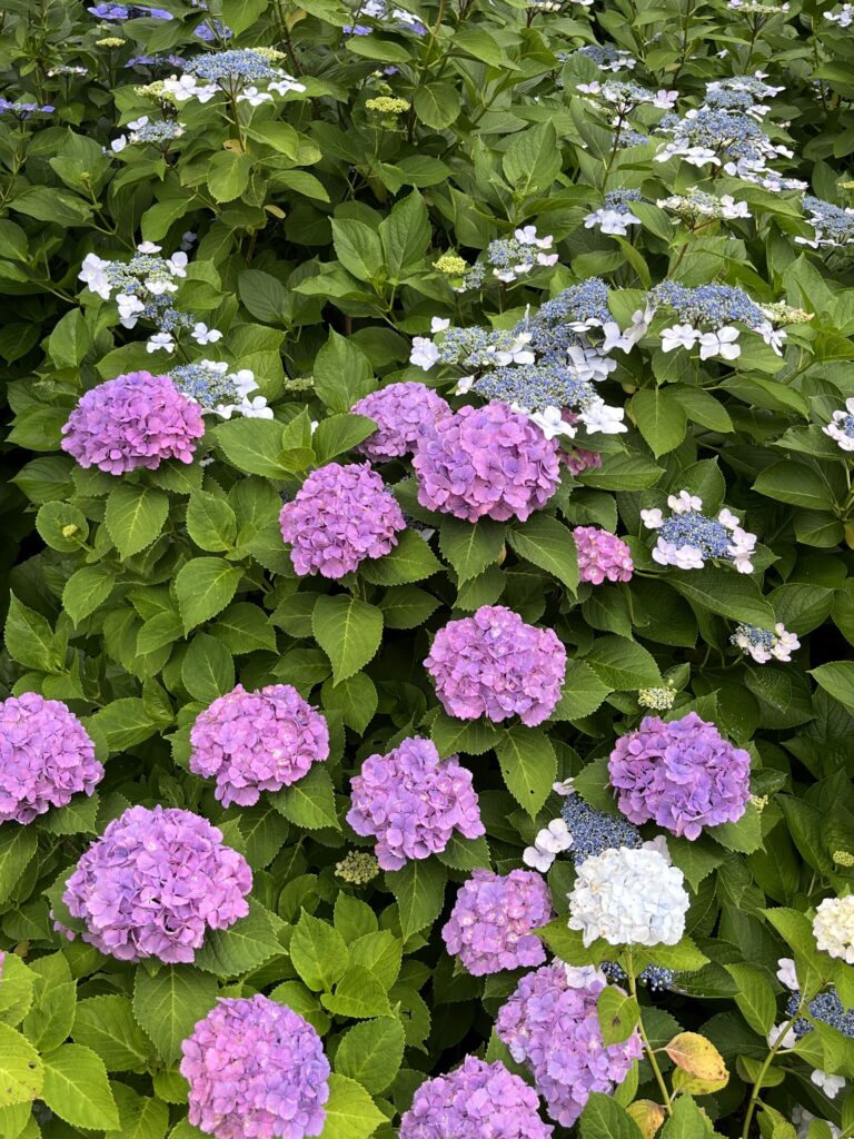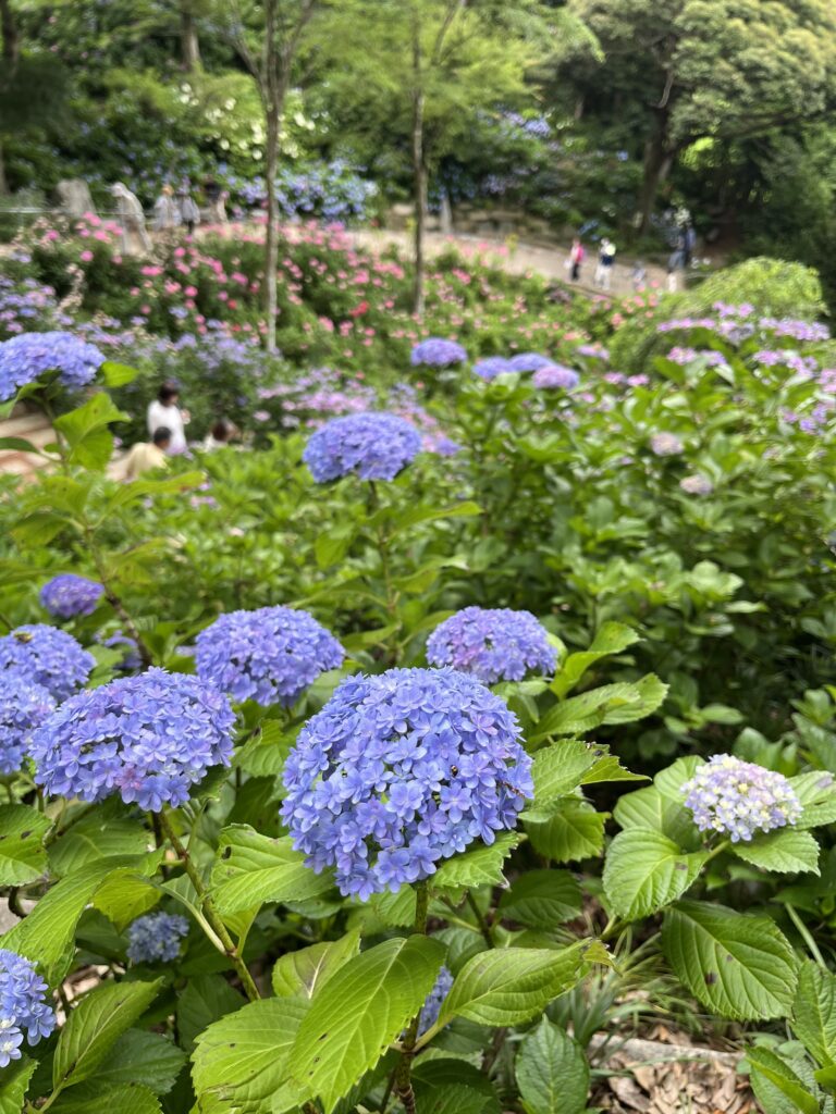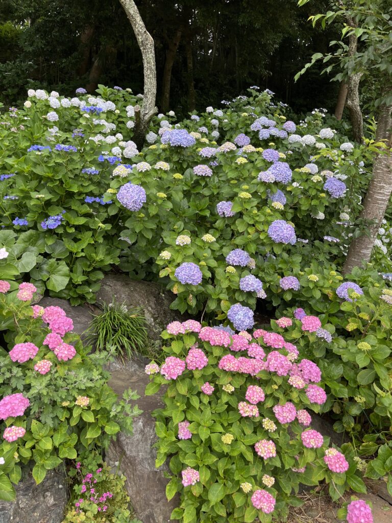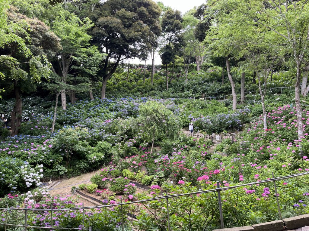 園内には約100種類のあじさいが群生し、山の斜面を活かした散策路から美しい眺望を楽しむことができます。